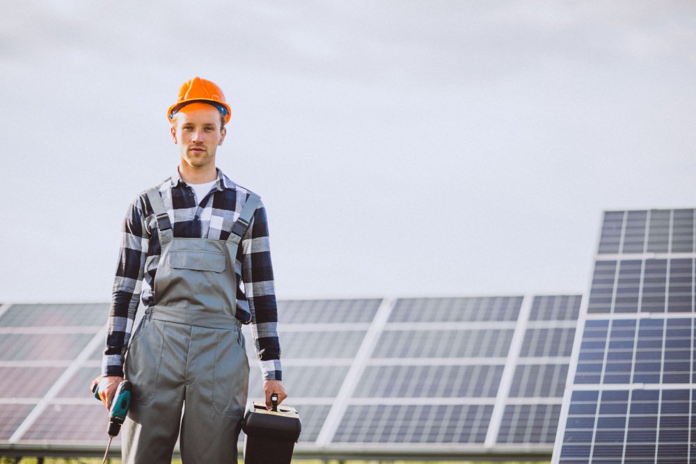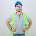 - young build worker in hard hat, safety glasses, construction vest, t-shirt holding hands on waist and looking positive , front view.