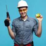 - Studio picture of hardworking handsome young handyman wearing hardhat and glasses posing at blue wall with drill in one hand and green apple in other, having lunch break while doing repair works